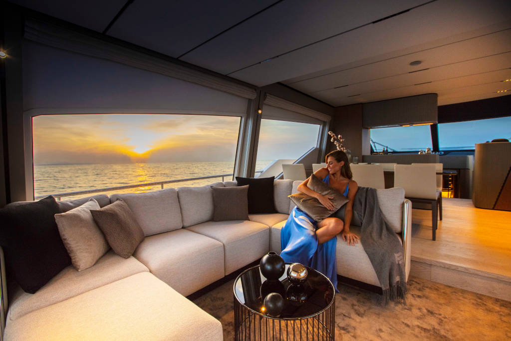 线条、装潢与材料的巧妙和谐,创造出独一无二的巡航体验。得益于超大面积玻璃窗,即便您身处室内,同样可以饱享全景,湛蓝的海天美景源源不断地涌入室内。