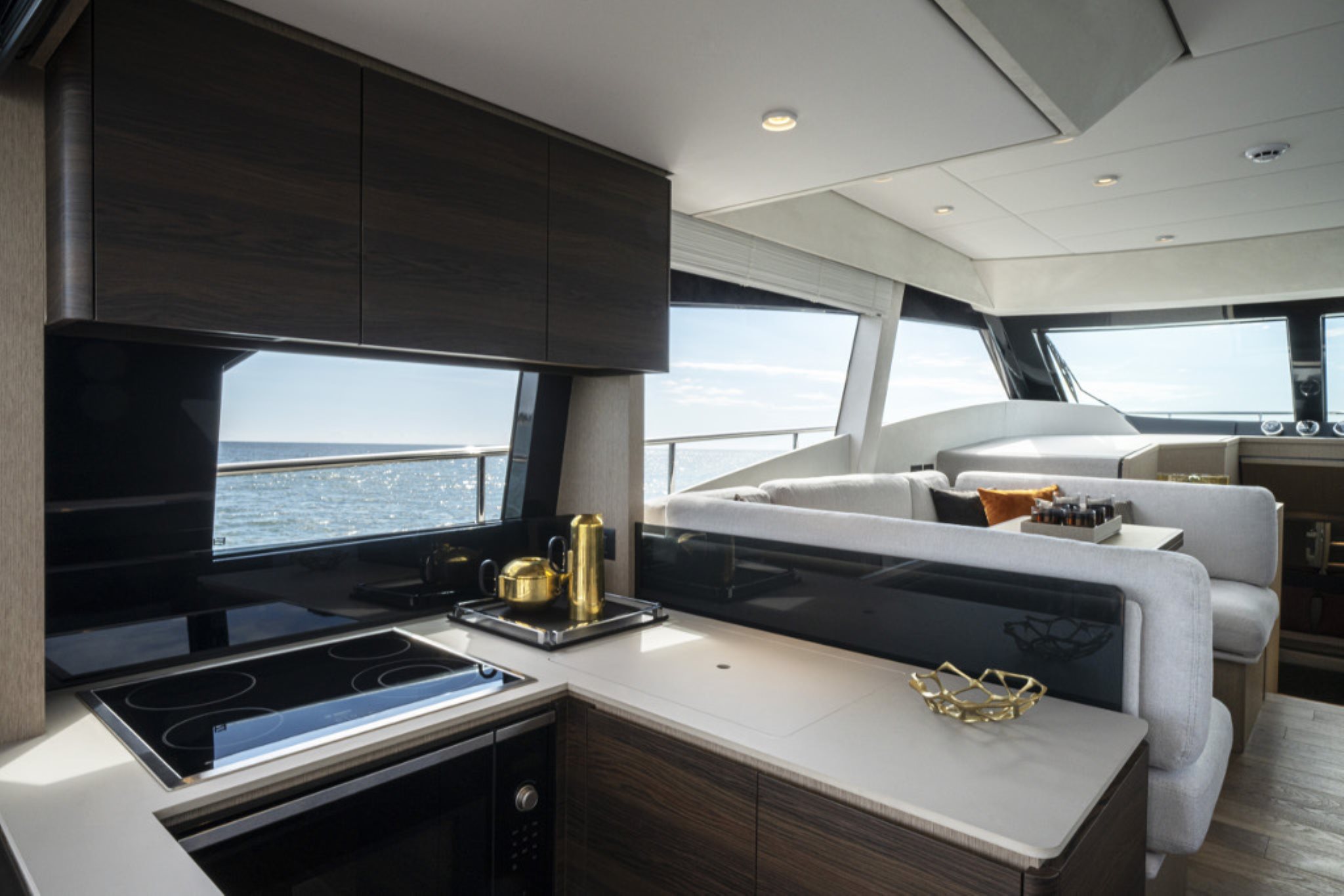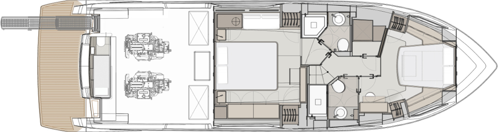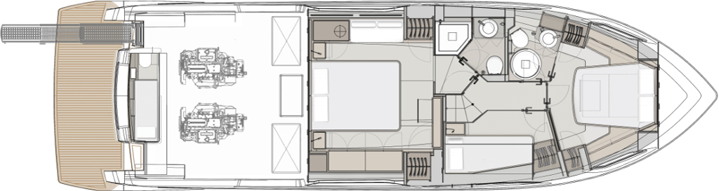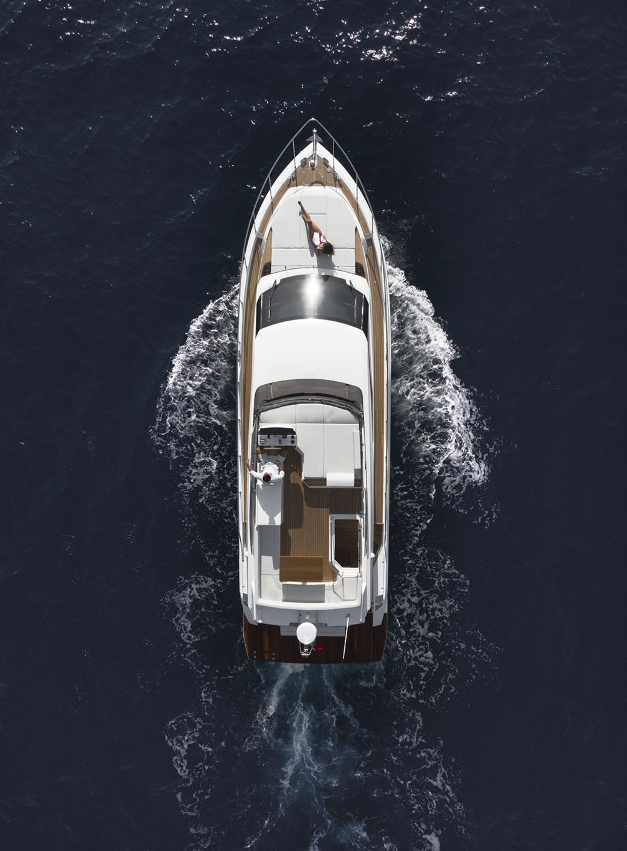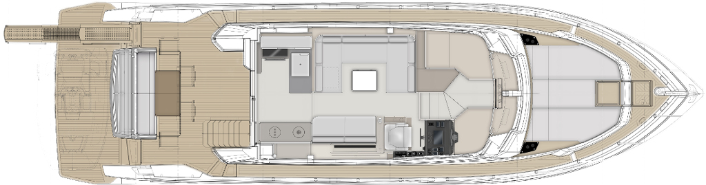 The new flybridge celebrates the brand’s continuous evolution in pursuit of the perfect blend of comfort, liveability and refined beauty. This major restyling introduces exclusive features such as the elegant new exterior styling, the redesigned hard top, and interiors by Ideaeitalia.