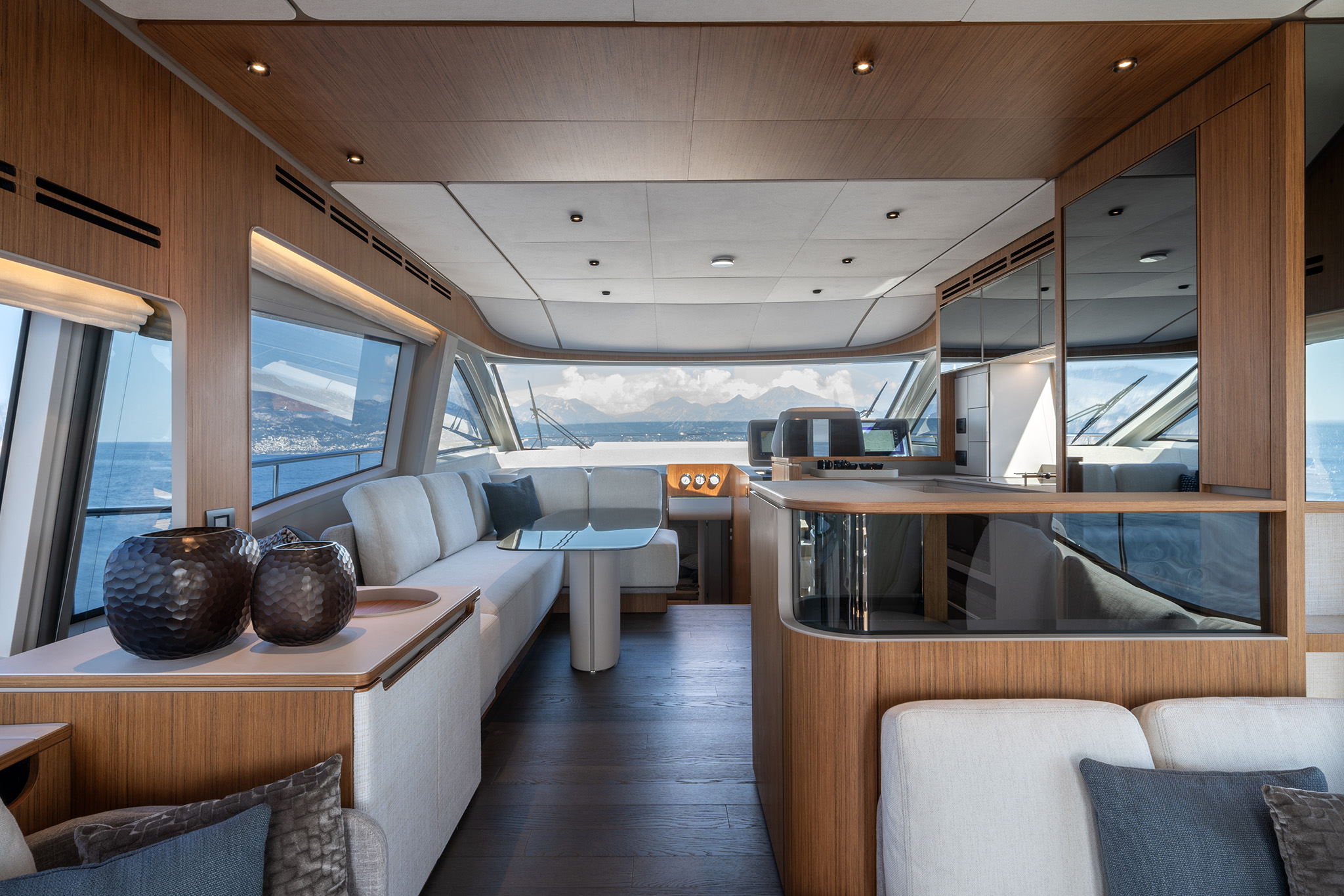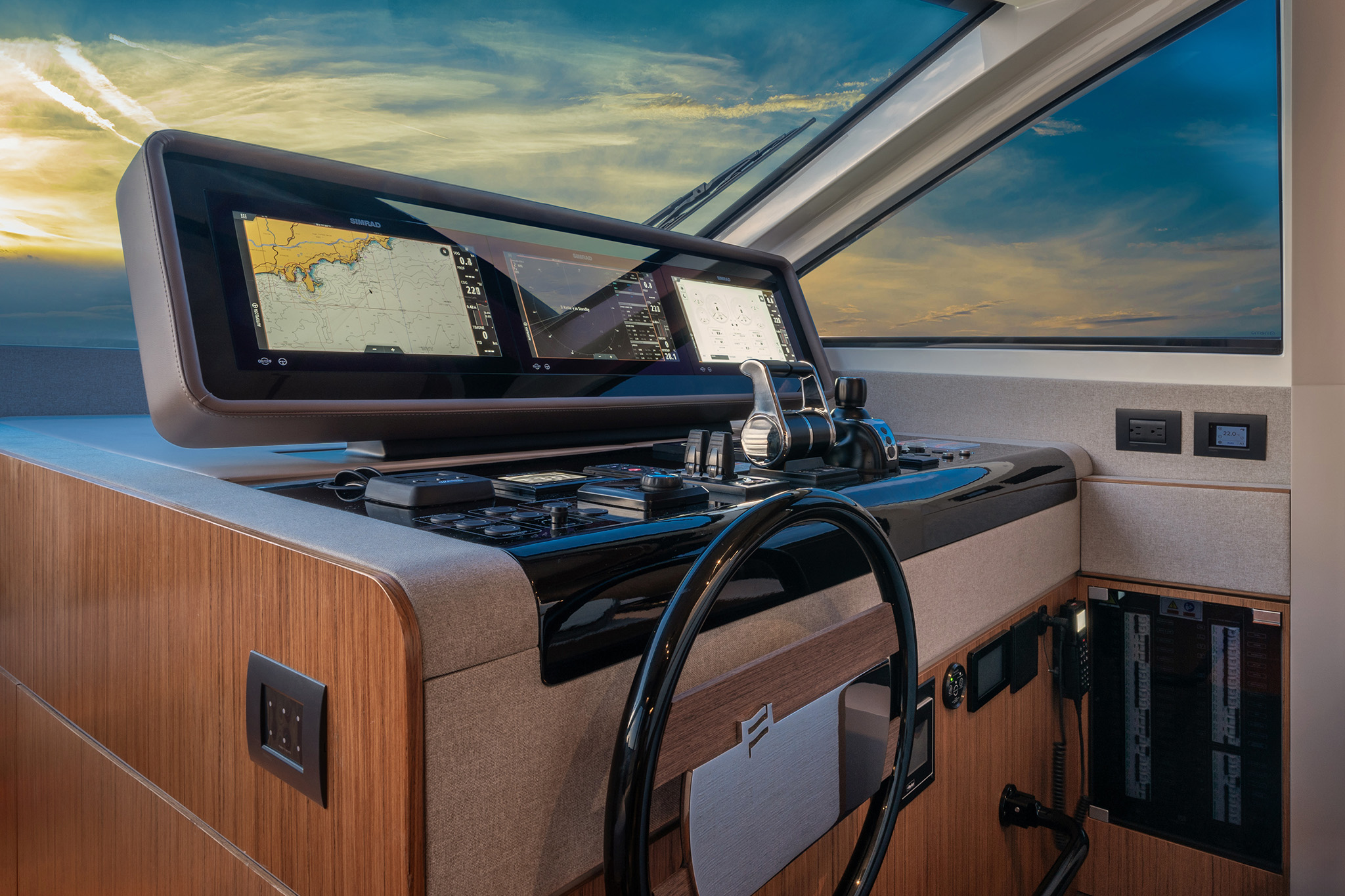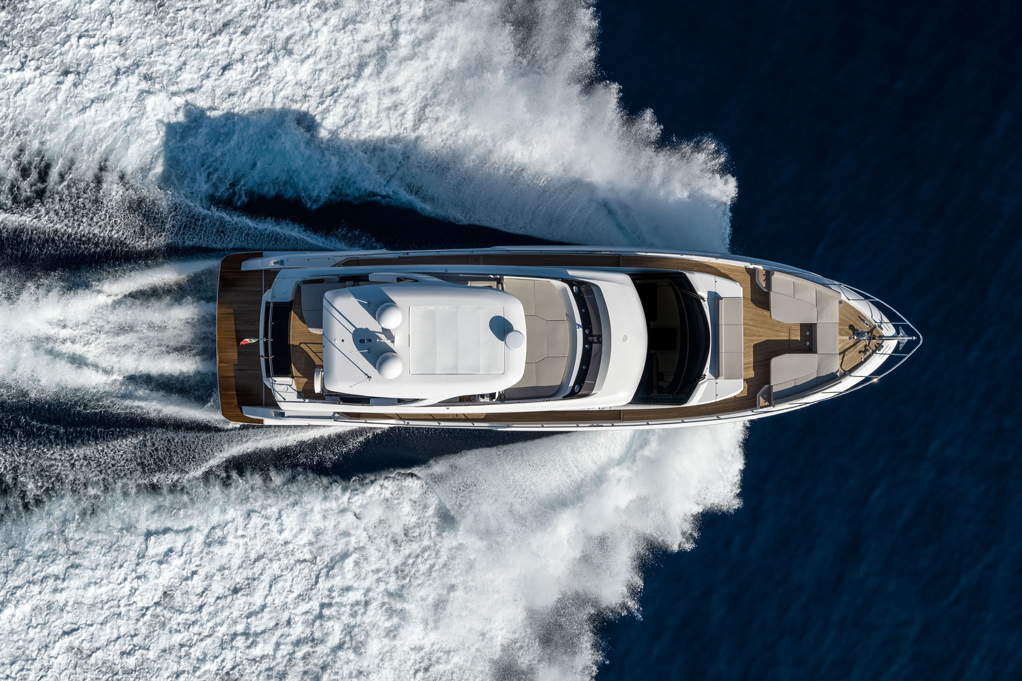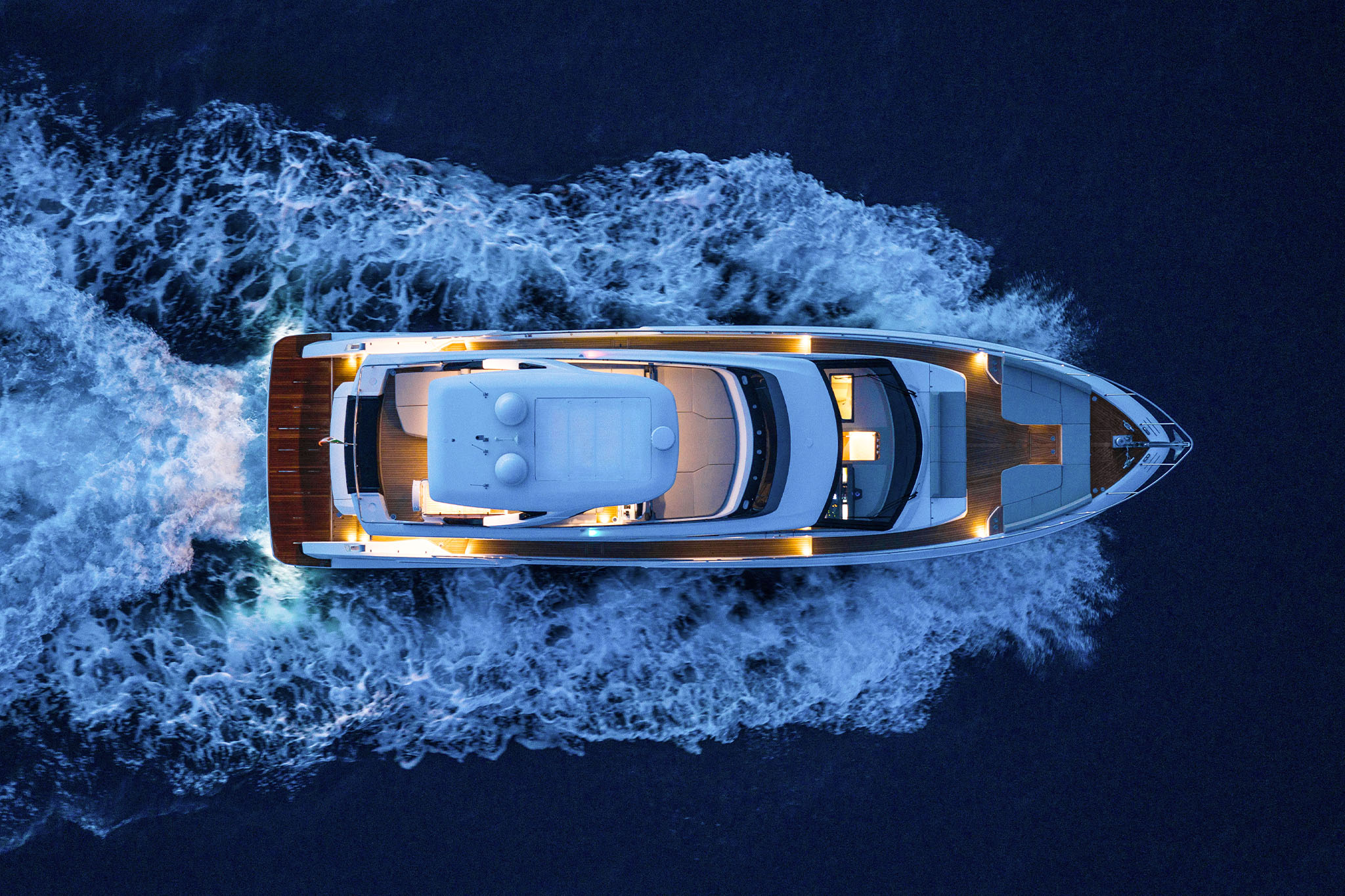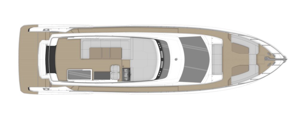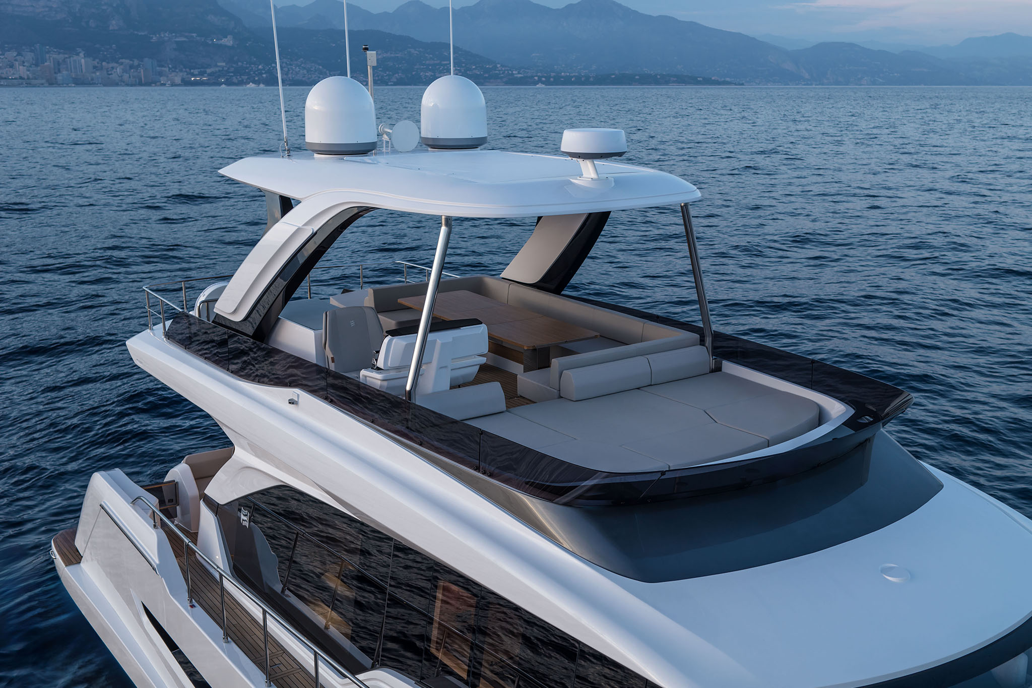 The new flybridge celebrates the brand’s continuous evolution in pursuit of the perfect blend of comfort, liveability and refined beauty. This major restyling introduces exclusive features such as the elegant new exterior styling, the redesigned hard top, and interiors by Ideaeitalia.