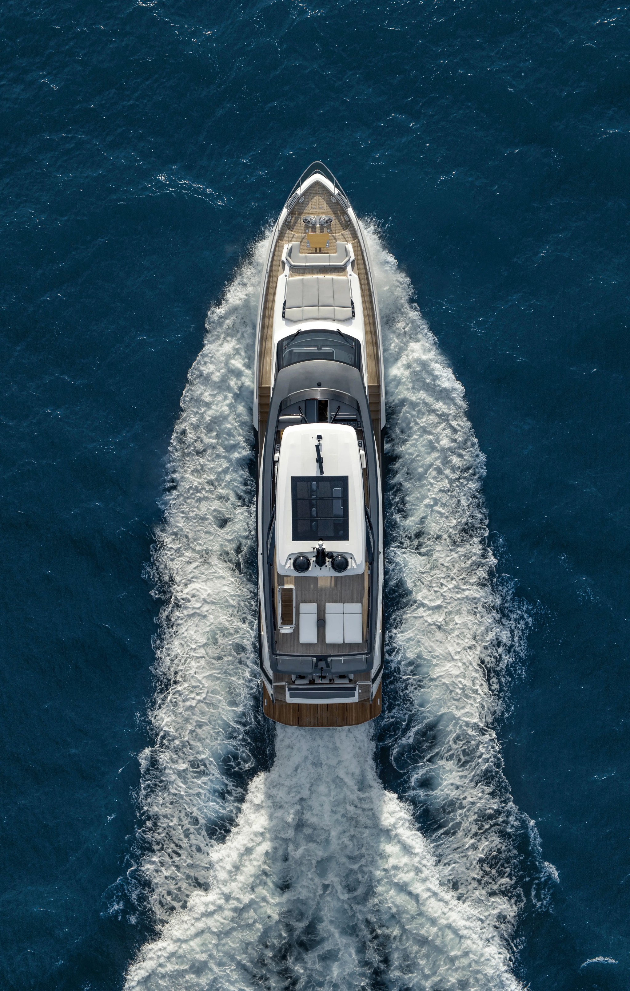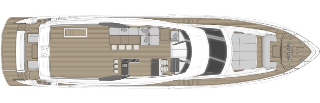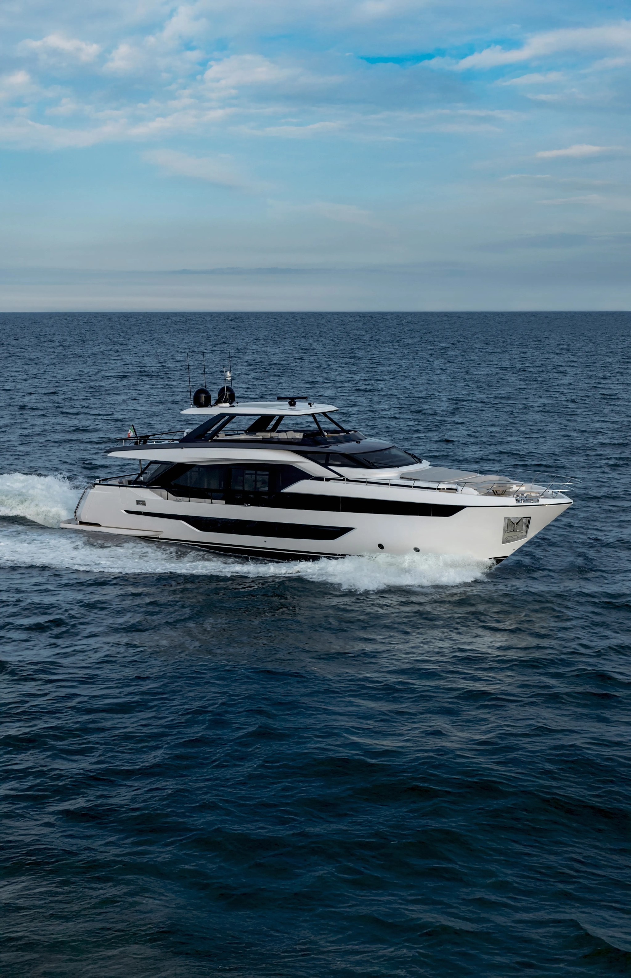 The new flybridge celebrates the brand’s continuous evolution in pursuit of the perfect blend of comfort, liveability and refined beauty. This major restyling introduces exclusive features such as the elegant new exterior styling, the redesigned hard top, and interiors by Ideaeitalia.