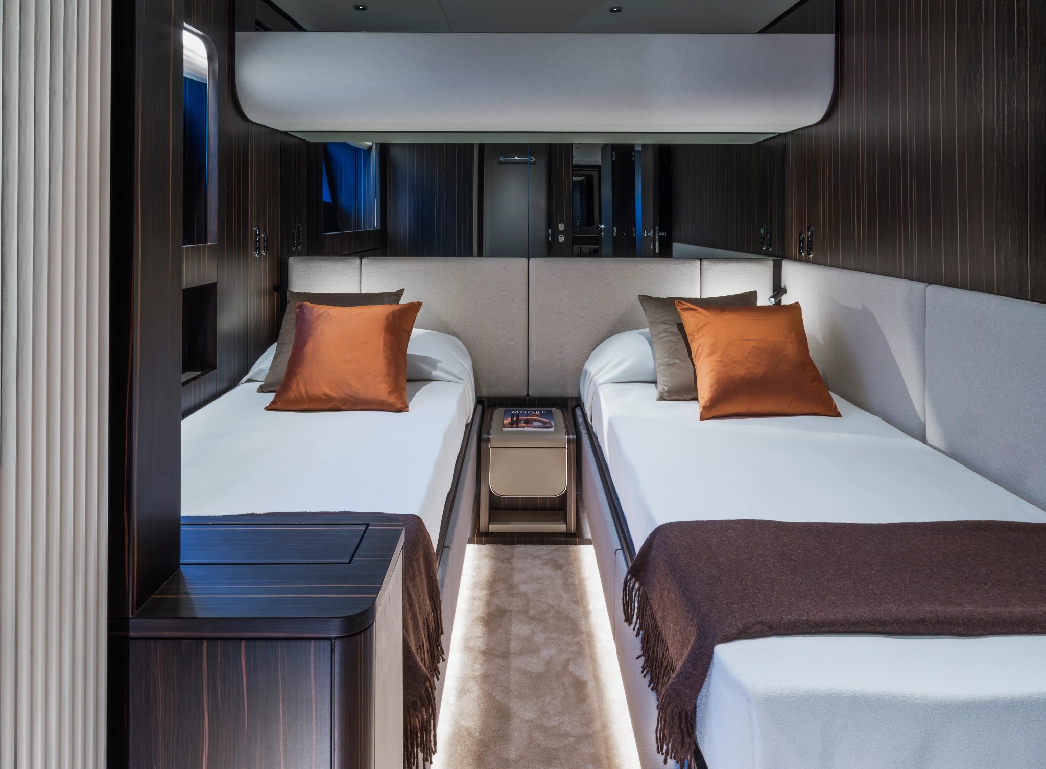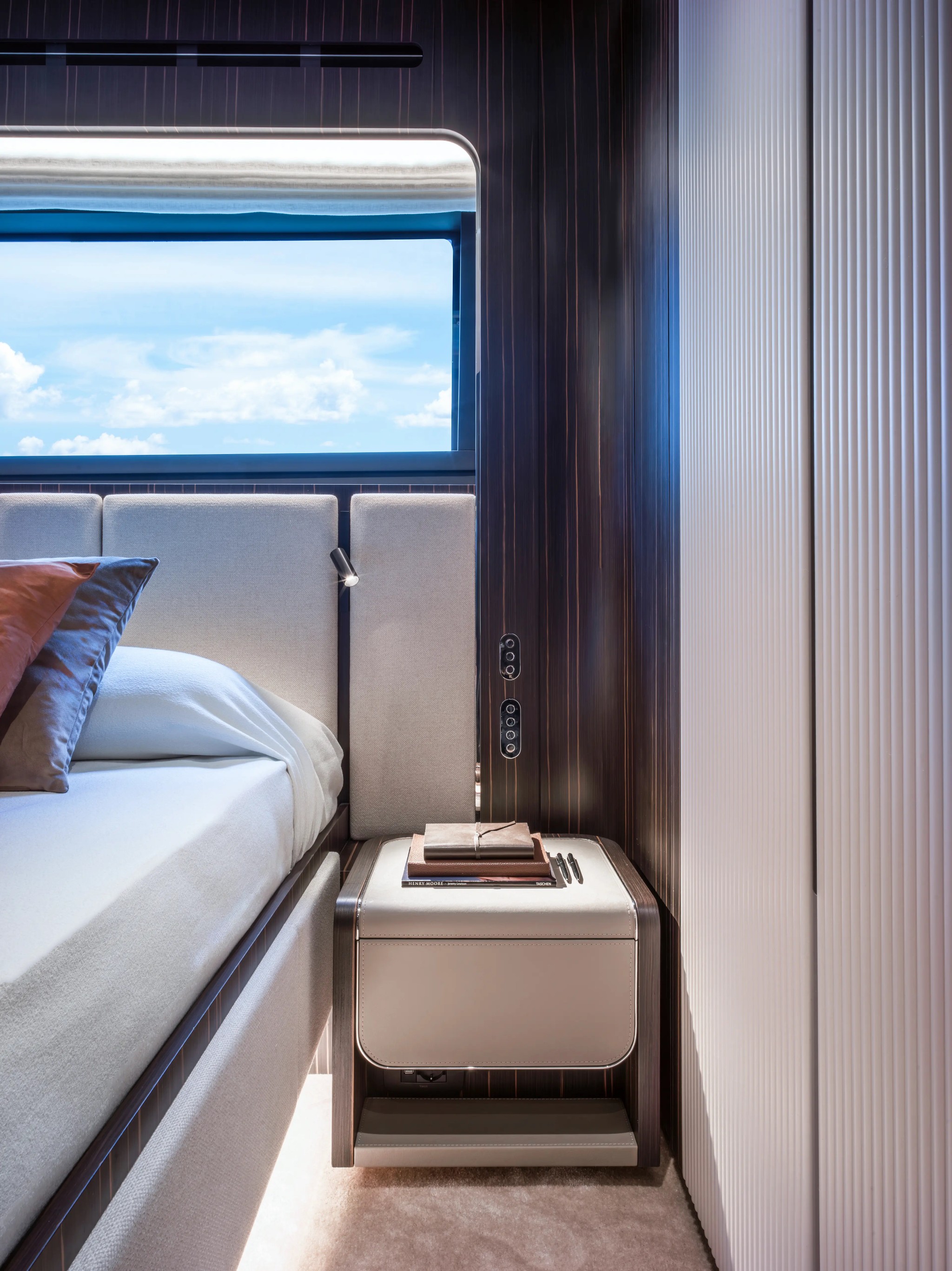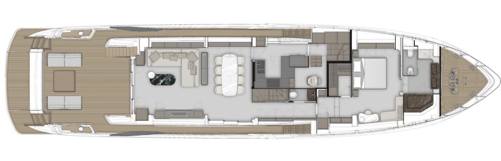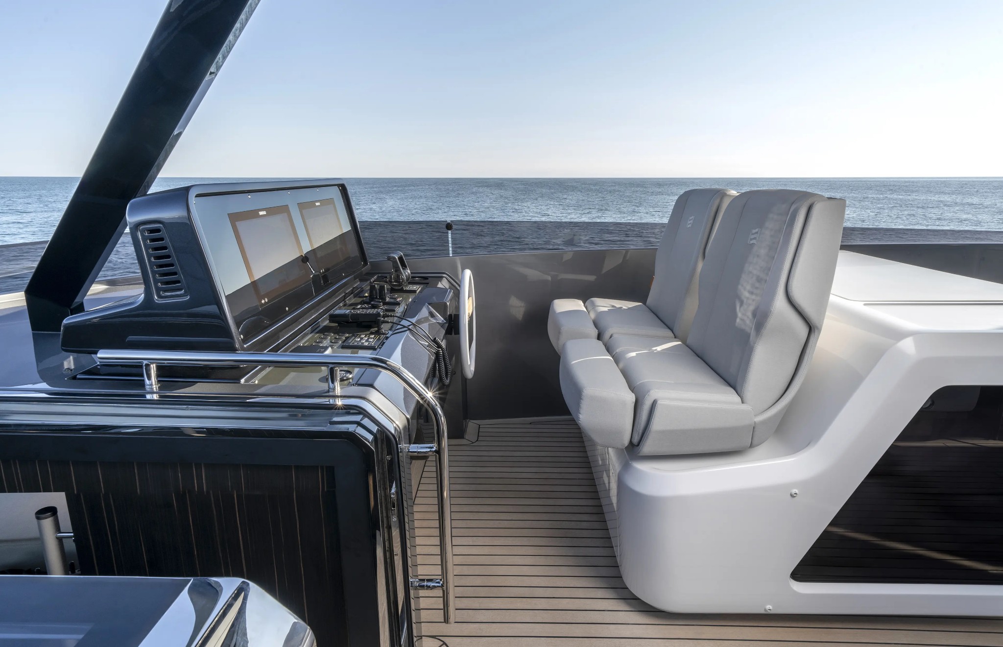 The new flybridge celebrates the brand’s continuous evolution in pursuit of the perfect blend of comfort, liveability and refined beauty. This major restyling introduces exclusive features such as the elegant new exterior styling, the redesigned hard top, and interiors by Ideaeitalia.